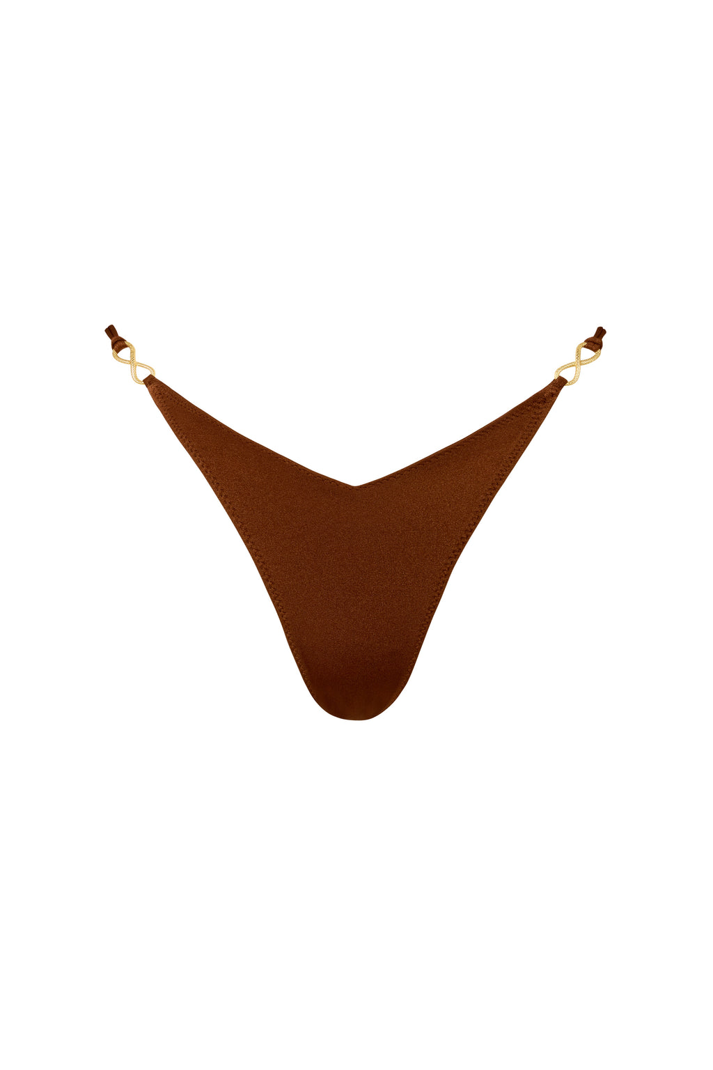 The Liora in Chocolate Fondant by Sommer Swim is a brazilian bikini bottom featuring a V-cut front with exclusive Infinity gold hardware embellishment.